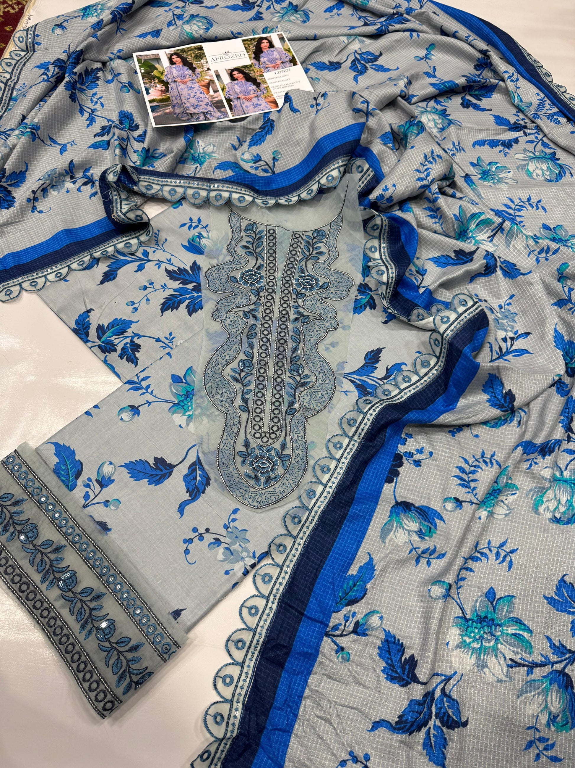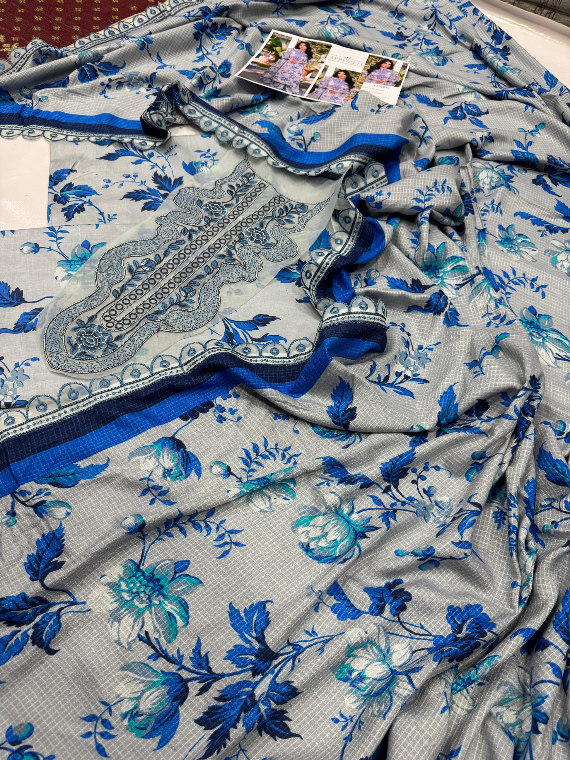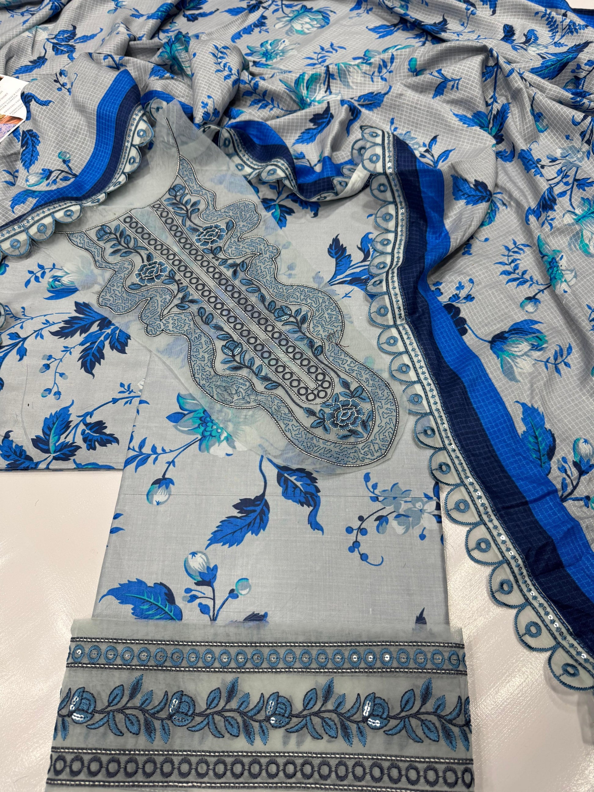 Linen Digital Print Shirt Linen Digital Print Trouser Linen Digital Print Dupatta Ready To Wear 4 Side Lace. Heavy Embroidered Work Patches on Organza.