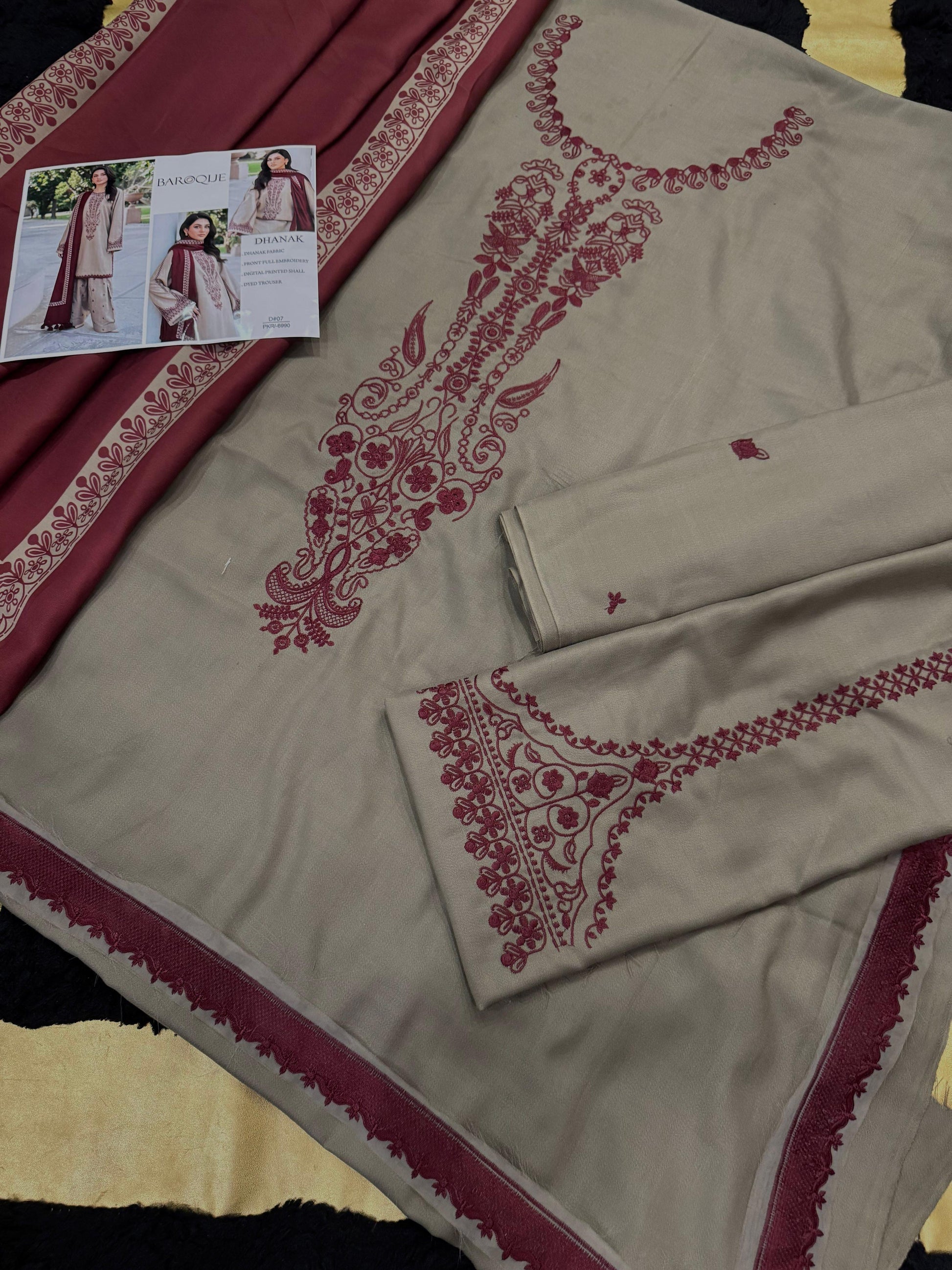 *Dhanak Embroidered Shirt**Dhanak Embroidered Sleeves**Dhanak Embroidered Trouser**Digital Printed Wool Shawl.**Daman With Embroidered Work Lace*